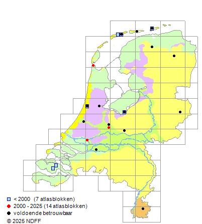 Het voor waarnemingsinspanning gecorrigeerde, of door een expert geschatte aantal atlasblokken (5x5 km) waarin de soort voorkomt per periode van tien jaar. Soms fluctueert het aantal sterk. Hoe vloeiender de lijn, des te betrouwbaarder de grafiek. Bron: Rode Lijst Mossen 2010. © BLWG 2011