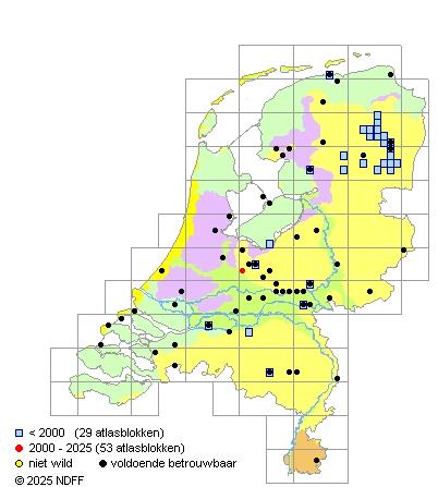 Het aantal atlasblokken (5x5 km) waarin de soort is gemeld binnen een periode van vijf jaar (vanaf 1980) of twintig jaar. Niet gecorrigeerd voor waarnemersinspanning en het aantal doorgegeven waarnemingen kan sterk variëren per periode, dus een trend in verspreiding kan hier niet direct uit worden afgelezen. Het opgegeven jaartal is het eerste jaar van de periode. Bron: gevalideerde waarnemingen uit de NDFF.