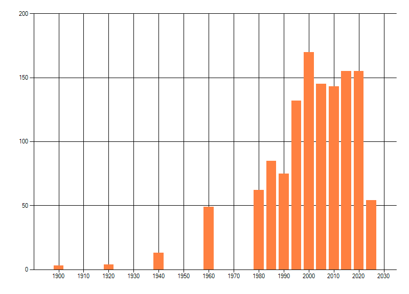 Het aantal atlasblokken (5x5 km) waarin de soort is gemeld binnen een periode van vijf jaar (vanaf 1980) of twintig jaar. Niet gecorrigeerd voor waarnemersinspanning en het aantal doorgegeven waarnemingen kan sterk variëren per periode, dus een trend in verspreiding kan hier niet direct uit worden afgelezen. Het opgegeven jaartal is het eerste jaar van de periode. Bron: gevalideerde waarnemingen uit de NDFF.