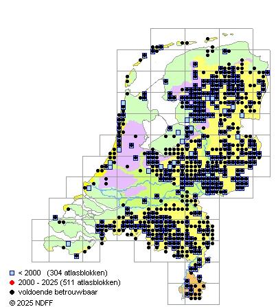 Het voor waarnemingsinspanning gecorrigeerde, of door een expert geschatte aantal atlasblokken (5x5 km) waarin de soort voorkomt per periode van tien jaar. Soms fluctueert het aantal sterk. Hoe vloeiender de lijn, des te betrouwbaarder de grafiek. Bron: Rode Lijst Mossen 2010. © BLWG 2011