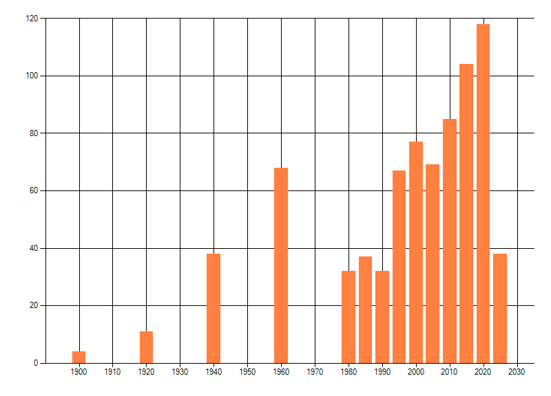 Het aantal atlasblokken (5x5 km) waarin de soort is gemeld binnen een periode van vijf jaar (vanaf 1980) of twintig jaar. Niet gecorrigeerd voor waarnemersinspanning en het aantal doorgegeven waarnemingen kan sterk variƫren per periode, dus een trend in verspreiding kan hier niet direct uit worden afgelezen. Het opgegeven jaartal is het eerste jaar van de periode. Bron: gevalideerde waarnemingen uit de NDFF.