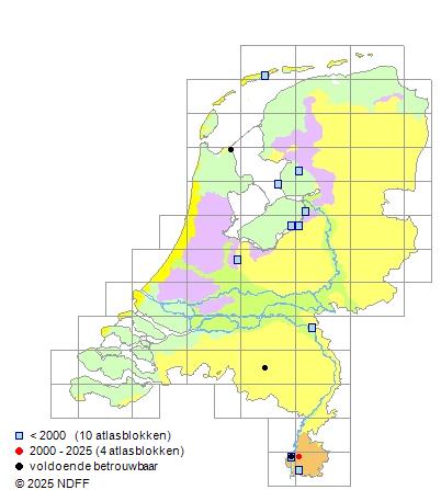 Het voor waarnemingsinspanning gecorrigeerde, of door een expert geschatte aantal atlasblokken (5x5 km) waarin de soort voorkomt per periode van tien jaar. Soms fluctueert het aantal sterk. Hoe vloeiender de lijn, des te betrouwbaarder de grafiek. Bron: Rode Lijst Mossen 2010. © BLWG 2011
