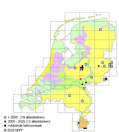 Het voor waarnemingsinspanning gecorrigeerde, of door een expert geschatte aantal atlasblokken (5x5 km) waarin de soort voorkomt per periode van tien jaar. Soms fluctueert het aantal sterk. Hoe vloeiender de lijn, des te betrouwbaarder de grafiek. Bron: Rode Lijst Mossen 2010. © BLWG 2011