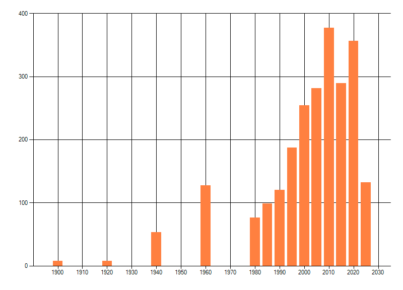 Het aantal atlasblokken (5x5 km) waarin de soort is gemeld binnen een periode van vijf jaar (vanaf 1980) of twintig jaar. Niet gecorrigeerd voor waarnemersinspanning en het aantal doorgegeven waarnemingen kan sterk variƫren per periode, dus een trend in verspreiding kan hier niet direct uit worden afgelezen. Het opgegeven jaartal is het eerste jaar van de periode. Bron: gevalideerde waarnemingen uit de NDFF.