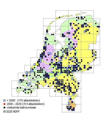 Het voor waarnemingsinspanning gecorrigeerde, of door een expert geschatte aantal atlasblokken (5x5 km) waarin de soort voorkomt per periode van tien jaar. Soms fluctueert het aantal sterk. Hoe vloeiender de lijn, des te betrouwbaarder de grafiek. Bron: Rode Lijst Mossen 2010. © BLWG 2011