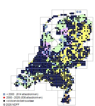 Het voor waarnemingsinspanning gecorrigeerde, of door een expert geschatte aantal atlasblokken (5x5 km) waarin de soort voorkomt per periode van tien jaar. Soms fluctueert het aantal sterk. Hoe vloeiender de lijn, des te betrouwbaarder de grafiek. Bron: Rode Lijst Mossen 2010. © BLWG 2011