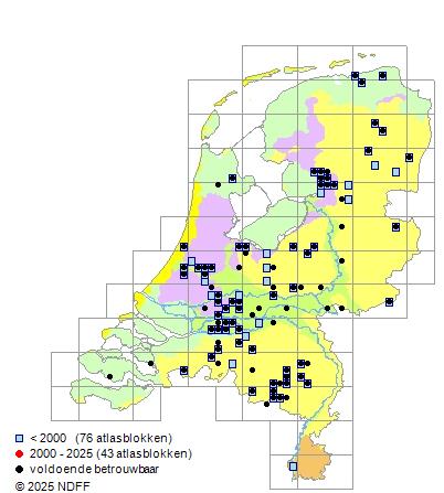 Het aantal atlasblokken (5x5 km) waarin de soort is gemeld binnen een periode van vijf jaar (vanaf 1980) of twintig jaar. Niet gecorrigeerd voor waarnemersinspanning en het aantal doorgegeven waarnemingen kan sterk variëren per periode, dus een trend in verspreiding kan hier niet direct uit worden afgelezen. Het opgegeven jaartal is het eerste jaar van de periode. Bron: gevalideerde waarnemingen uit de NDFF.