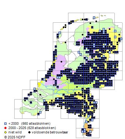 Het aantal atlasblokken (5x5 km) waarin de soort is gemeld binnen een periode van vijf jaar (vanaf 1980) of twintig jaar. Niet gecorrigeerd voor waarnemersinspanning en het aantal doorgegeven waarnemingen kan sterk variëren per periode, dus een trend in verspreiding kan hier niet direct uit worden afgelezen. Het opgegeven jaartal is het eerste jaar van de periode. Bron: gevalideerde waarnemingen uit de NDFF.