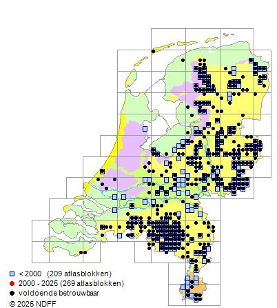 Het voor waarnemingsinspanning gecorrigeerde, of door een expert geschatte aantal atlasblokken (5x5 km) waarin de soort voorkomt per periode van tien jaar. Soms fluctueert het aantal sterk. Hoe vloeiender de lijn, des te betrouwbaarder de grafiek. Bron: Rode Lijst Mossen 2010. © BLWG 2011