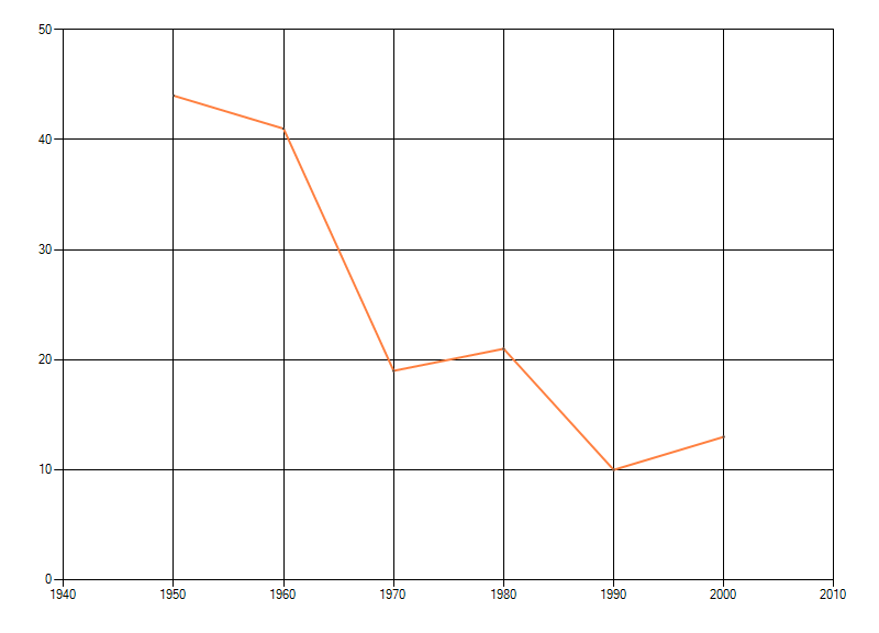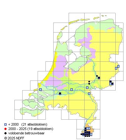 Het voor waarnemingsinspanning gecorrigeerde, of door een expert geschatte aantal atlasblokken (5x5 km) waarin de soort voorkomt per periode van tien jaar. Soms fluctueert het aantal sterk. Hoe vloeiender de lijn, des te betrouwbaarder de grafiek. Bron: Rode Lijst Mossen 2010. © BLWG 2011