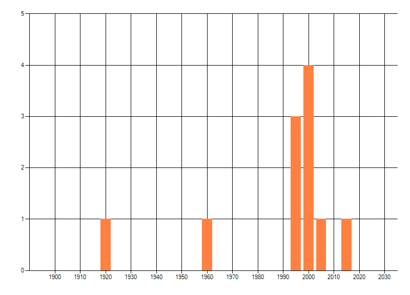 Het aantal atlasblokken (5x5 km) waarin de soort is gemeld binnen een periode van vijf jaar (vanaf 1980) of twintig jaar. Niet gecorrigeerd voor waarnemersinspanning en het aantal doorgegeven waarnemingen kan sterk variëren per periode, dus een trend in verspreiding kan hier niet direct uit worden afgelezen. Het opgegeven jaartal is het eerste jaar van de periode. Bron: gevalideerde waarnemingen uit de NDFF.