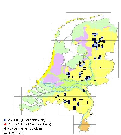 Het aantal atlasblokken (5x5 km) waarin de soort is gemeld binnen een periode van vijf jaar (vanaf 1980) of twintig jaar. Niet gecorrigeerd voor waarnemersinspanning en het aantal doorgegeven waarnemingen kan sterk variëren per periode, dus een trend in verspreiding kan hier niet direct uit worden afgelezen. Het opgegeven jaartal is het eerste jaar van de periode. Bron: gevalideerde waarnemingen uit de NDFF.