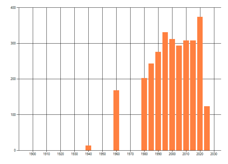 Het aantal atlasblokken (5x5 km) waarin de soort is gemeld binnen een periode van vijf jaar (vanaf 1980) of twintig jaar. Niet gecorrigeerd voor waarnemersinspanning en het aantal doorgegeven waarnemingen kan sterk variëren per periode, dus een trend in verspreiding kan hier niet direct uit worden afgelezen. Het opgegeven jaartal is het eerste jaar van de periode. Bron: gevalideerde waarnemingen uit de NDFF.