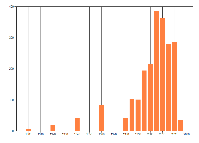 Het aantal atlasblokken (5x5 km) waarin de soort is gemeld binnen een periode van vijf jaar (vanaf 1980) of twintig jaar. Niet gecorrigeerd voor waarnemersinspanning en het aantal doorgegeven waarnemingen kan sterk variëren per periode, dus een trend in verspreiding kan hier niet direct uit worden afgelezen. Het opgegeven jaartal is het eerste jaar van de periode. Bron: gevalideerde waarnemingen uit de NDFF.