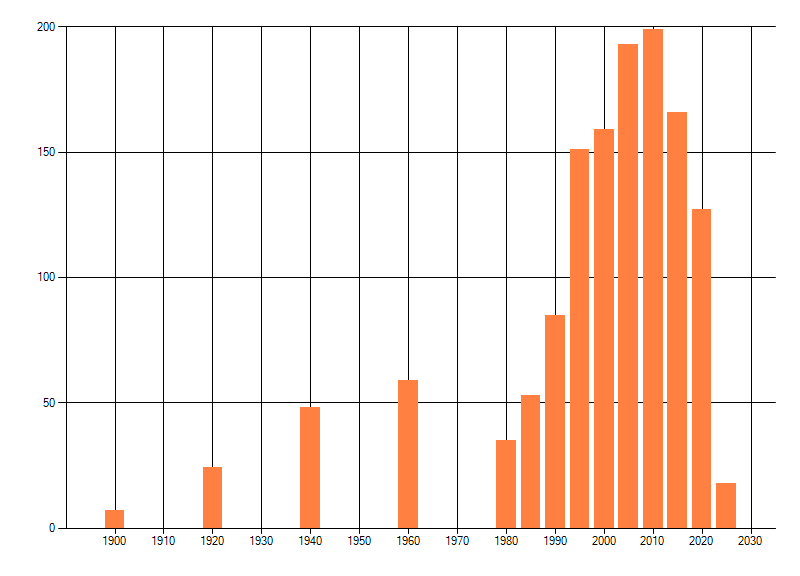 Het aantal atlasblokken (5x5 km) waarin de soort is gemeld binnen een periode van vijf jaar (vanaf 1980) of twintig jaar. Niet gecorrigeerd voor waarnemersinspanning en het aantal doorgegeven waarnemingen kan sterk variëren per periode, dus een trend in verspreiding kan hier niet direct uit worden afgelezen. Het opgegeven jaartal is het eerste jaar van de periode. Bron: gevalideerde waarnemingen uit de NDFF.
