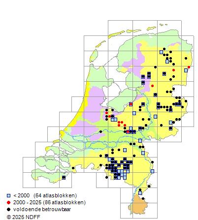 The presence of Philonotis fontana var. caespitosa in The Netherlands is only since 2012 better recognized. The species is rather common on wet sandy soils, maily when influenced by some seepage water. There are no indications for changes in presence In The Netherlands. The species is less common than Philonotis fontana var. fontana.