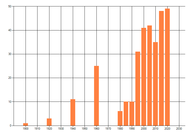 Het aantal atlasblokken (5x5 km) waarin de soort is gemeld binnen een periode van vijf jaar (vanaf 1980) of twintig jaar. Niet gecorrigeerd voor waarnemersinspanning en het aantal doorgegeven waarnemingen kan sterk variëren per periode, dus een trend in verspreiding kan hier niet direct uit worden afgelezen. Het opgegeven jaartal is het eerste jaar van de periode. Bron: gevalideerde waarnemingen uit de NDFF.