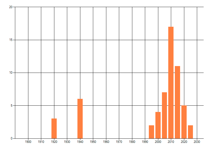 Het aantal atlasblokken (5x5 km) waarin de soort is gemeld binnen een periode van vijf jaar (vanaf 1980) of twintig jaar. Niet gecorrigeerd voor waarnemersinspanning en het aantal doorgegeven waarnemingen kan sterk variëren per periode, dus een trend in verspreiding kan hier niet direct uit worden afgelezen. Het opgegeven jaartal is het eerste jaar van de periode. Bron: gevalideerde waarnemingen uit de NDFF.