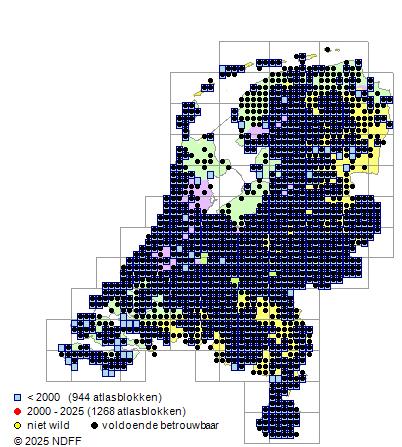 Het aantal atlasblokken (5x5 km) waarin de soort is gemeld binnen een periode van vijf jaar (vanaf 1980) of twintig jaar. Niet gecorrigeerd voor waarnemersinspanning en het aantal doorgegeven waarnemingen kan sterk variëren per periode, dus een trend in verspreiding kan hier niet direct uit worden afgelezen. Het opgegeven jaartal is het eerste jaar van de periode. Bron: gevalideerde waarnemingen uit de NDFF.