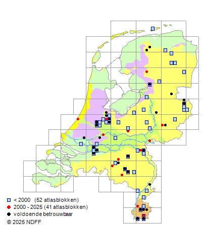 Het voor waarnemingsinspanning gecorrigeerde, of door een expert geschatte aantal atlasblokken (5x5 km) waarin de soort voorkomt per periode van tien jaar. Soms fluctueert het aantal sterk. Hoe vloeiender de lijn, des te betrouwbaarder de grafiek. Bron: Rode Lijst Mossen 2010. © BLWG 2011