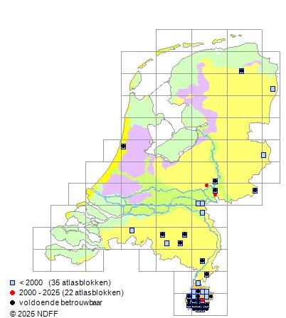 Het voor waarnemingsinspanning gecorrigeerde, of door een expert geschatte aantal atlasblokken (5x5 km) waarin de soort voorkomt per periode van tien jaar. Soms fluctueert het aantal sterk. Hoe vloeiender de lijn, des te betrouwbaarder de grafiek. Bron: Rode Lijst Mossen 2010. © BLWG 2011