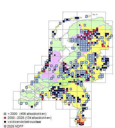 Het aantal atlasblokken (5x5 km) waarin de soort is gemeld binnen een periode van vijf jaar (vanaf 1980) of twintig jaar. Niet gecorrigeerd voor waarnemersinspanning en het aantal doorgegeven waarnemingen kan sterk variëren per periode, dus een trend in verspreiding kan hier niet direct uit worden afgelezen. Het opgegeven jaartal is het eerste jaar van de periode. Bron: gevalideerde waarnemingen uit de NDFF.