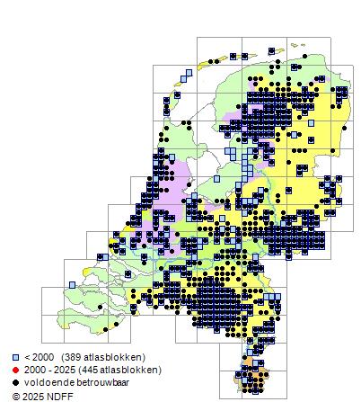 Het aantal atlasblokken (5x5 km) waarin de soort is gemeld binnen een periode van vijf jaar (vanaf 1980) of twintig jaar. Niet gecorrigeerd voor waarnemersinspanning en het aantal doorgegeven waarnemingen kan sterk variëren per periode, dus een trend in verspreiding kan hier niet direct uit worden afgelezen. Het opgegeven jaartal is het eerste jaar van de periode. Bron: gevalideerde waarnemingen uit de NDFF.