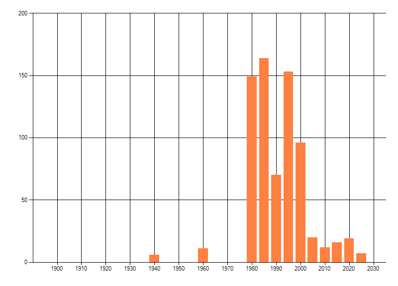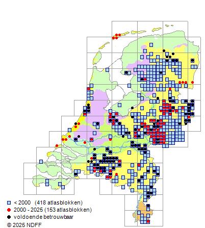 Het aantal atlasblokken (5x5 km) waarin de soort is gemeld binnen een periode van vijf jaar (vanaf 1980) of twintig jaar. Niet gecorrigeerd voor waarnemersinspanning en het aantal doorgegeven waarnemingen kan sterk variëren per periode, dus een trend in verspreiding kan hier niet direct uit worden afgelezen. Het opgegeven jaartal is het eerste jaar van de periode. Bron: gevalideerde waarnemingen uit de NDFF.