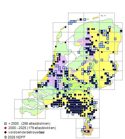 Het aantal atlasblokken (5x5 km) waarin de soort is gemeld binnen een periode van vijf jaar (vanaf 1980) of twintig jaar. Niet gecorrigeerd voor waarnemersinspanning en het aantal doorgegeven waarnemingen kan sterk variëren per periode, dus een trend in verspreiding kan hier niet direct uit worden afgelezen. Het opgegeven jaartal is het eerste jaar van de periode. Bron: gevalideerde waarnemingen uit de NDFF.