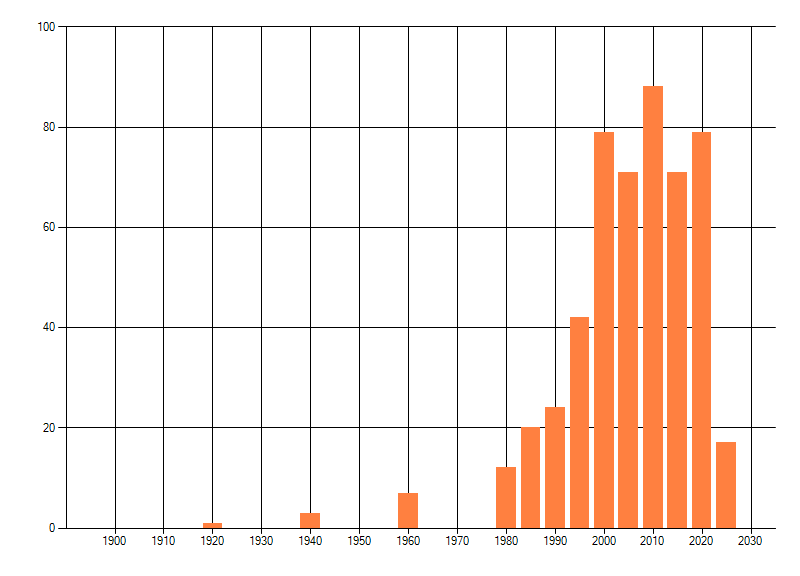 Het aantal atlasblokken (5x5 km) waarin de soort is gemeld binnen een periode van vijf jaar (vanaf 1980) of twintig jaar. Niet gecorrigeerd voor waarnemersinspanning en het aantal doorgegeven waarnemingen kan sterk variƫren per periode, dus een trend in verspreiding kan hier niet direct uit worden afgelezen. Het opgegeven jaartal is het eerste jaar van de periode. Bron: gevalideerde waarnemingen uit de NDFF.