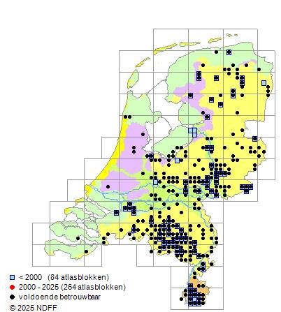 Het voor waarnemingsinspanning gecorrigeerde, of door een expert geschatte aantal atlasblokken (5x5 km) waarin de soort voorkomt per periode van tien jaar. Soms fluctueert het aantal sterk. Hoe vloeiender de lijn, des te betrouwbaarder de grafiek. Bron: Rode Lijst Mossen 2010. Ā© BLWG 2011