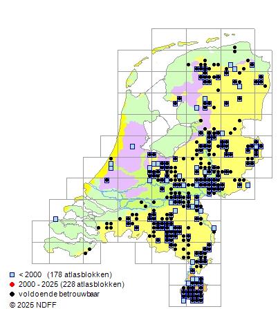 Het aantal atlasblokken (5x5 km) waarin de soort is gemeld binnen een periode van vijf jaar (vanaf 1980) of twintig jaar. Niet gecorrigeerd voor waarnemersinspanning en het aantal doorgegeven waarnemingen kan sterk variëren per periode, dus een trend in verspreiding kan hier niet direct uit worden afgelezen. Het opgegeven jaartal is het eerste jaar van de periode. Bron: gevalideerde waarnemingen uit de NDFF.