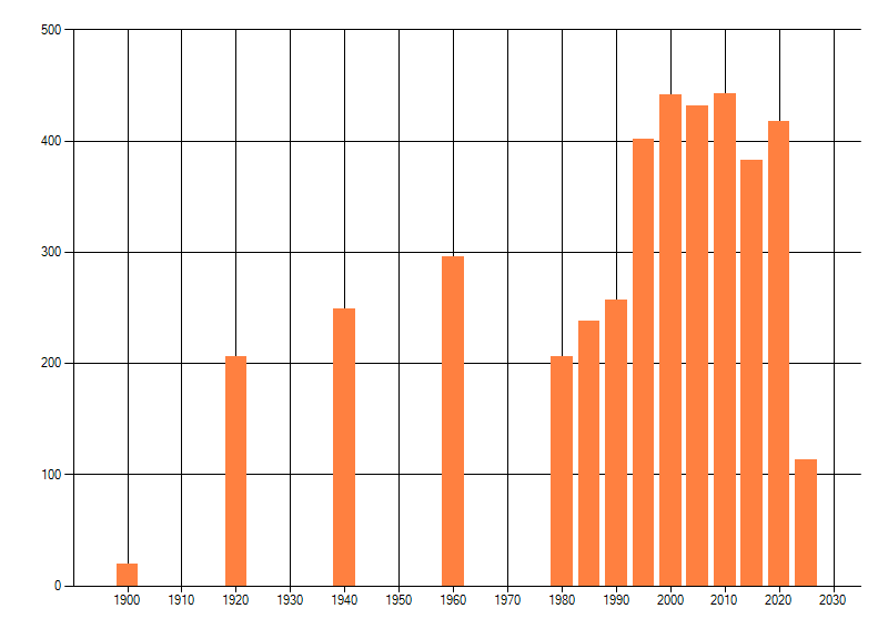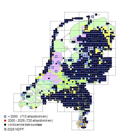 Het aantal atlasblokken (5x5 km) waarin de soort is gemeld binnen een periode van vijf jaar (vanaf 1980) of twintig jaar. Niet gecorrigeerd voor waarnemersinspanning en het aantal doorgegeven waarnemingen kan sterk variëren per periode, dus een trend in verspreiding kan hier niet direct uit worden afgelezen. Het opgegeven jaartal is het eerste jaar van de periode. Bron: gevalideerde waarnemingen uit de NDFF.