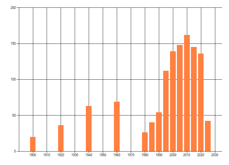Het aantal atlasblokken (5x5 km) waarin de soort is gemeld binnen een periode van vijf jaar (vanaf 1980) of twintig jaar. Niet gecorrigeerd voor waarnemersinspanning en het aantal doorgegeven waarnemingen kan sterk variƫren per periode, dus een trend in verspreiding kan hier niet direct uit worden afgelezen. Het opgegeven jaartal is het eerste jaar van de periode. Bron: gevalideerde waarnemingen uit de NDFF.