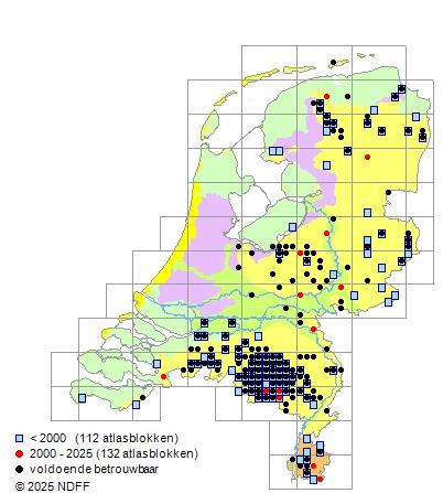 Het voor waarnemingsinspanning gecorrigeerde, of door een expert geschatte aantal atlasblokken (5x5 km) waarin de soort voorkomt per periode van tien jaar. Soms fluctueert het aantal sterk. Hoe vloeiender de lijn, des te betrouwbaarder de grafiek. Bron: Rode Lijst Mossen 2010. © BLWG 2011