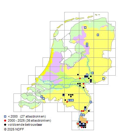 Het voor waarnemingsinspanning gecorrigeerde, of door een expert geschatte aantal atlasblokken (5x5 km) waarin de soort voorkomt per periode van tien jaar. Soms fluctueert het aantal sterk. Hoe vloeiender de lijn, des te betrouwbaarder de grafiek. Bron: Rode Lijst Mossen 2010. © BLWG 2011