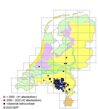 Het voor waarnemingsinspanning gecorrigeerde, of door een expert geschatte aantal atlasblokken (5x5 km) waarin de soort voorkomt per periode van tien jaar. Soms fluctueert het aantal sterk. Hoe vloeiender de lijn, des te betrouwbaarder de grafiek. Bron: Rode Lijst Mossen 2010. © BLWG 2011
