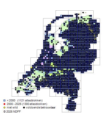 Het aantal atlasblokken (5x5 km) waarin de soort is gemeld binnen een periode van vijf jaar (vanaf 1980) of twintig jaar. Niet gecorrigeerd voor waarnemersinspanning en het aantal doorgegeven waarnemingen kan sterk variƫren per periode, dus een trend in verspreiding kan hier niet direct uit worden afgelezen. Het opgegeven jaartal is het eerste jaar van de periode. Bron: gevalideerde waarnemingen uit de NDFF.