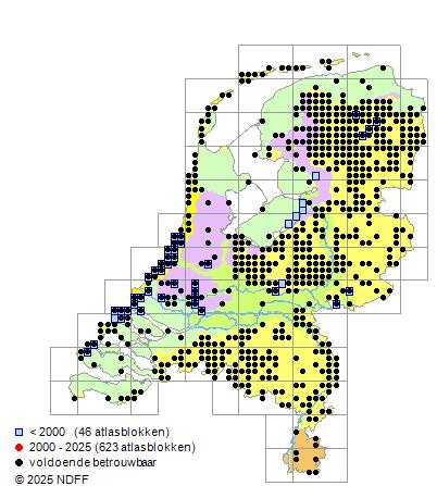 Het voor waarnemingsinspanning gecorrigeerde, of door een expert geschatte aantal atlasblokken (5x5 km) waarin de soort voorkomt per periode van tien jaar. Soms fluctueert het aantal sterk. Hoe vloeiender de lijn, des te betrouwbaarder de grafiek. Bron: Rode Lijst Mossen 2010. © BLWG 2011
