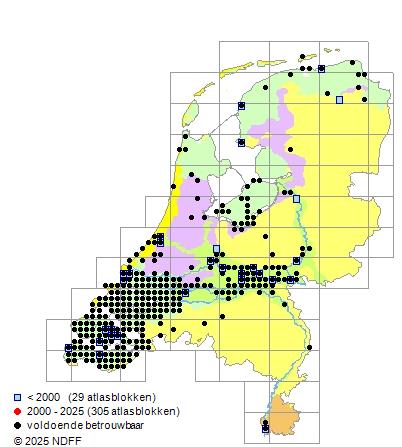 Het voor waarnemingsinspanning gecorrigeerde, of door een expert geschatte aantal atlasblokken (5x5 km) waarin de soort voorkomt per periode van tien jaar. Soms fluctueert het aantal sterk. Hoe vloeiender de lijn, des te betrouwbaarder de grafiek. Bron: Rode Lijst Mossen 2010. © BLWG 2011