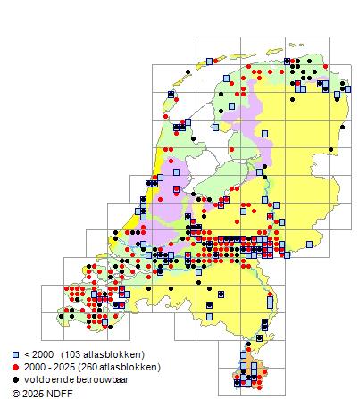 Het voor waarnemingsinspanning gecorrigeerde, of door een expert geschatte aantal atlasblokken (5x5 km) waarin de soort voorkomt per periode van tien jaar. Soms fluctueert het aantal sterk. Hoe vloeiender de lijn, des te betrouwbaarder de grafiek. Bron: Rode Lijst Mossen 2010. © BLWG 2011