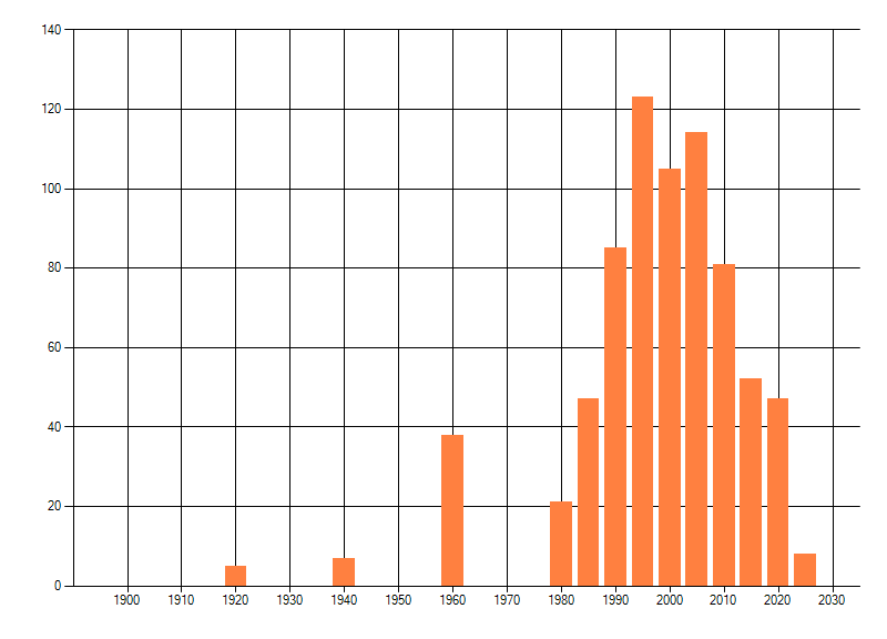 Het aantal atlasblokken (5x5 km) waarin de soort is gemeld binnen een periode van vijf jaar (vanaf 1980) of twintig jaar. Niet gecorrigeerd voor waarnemersinspanning en het aantal doorgegeven waarnemingen kan sterk variëren per periode, dus een trend in verspreiding kan hier niet direct uit worden afgelezen. Het opgegeven jaartal is het eerste jaar van de periode. Bron: gevalideerde waarnemingen uit de NDFF.