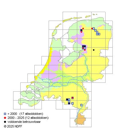 Het voor waarnemingsinspanning gecorrigeerde, of door een expert geschatte aantal atlasblokken (5x5 km) waarin de soort voorkomt per periode van tien jaar. Soms fluctueert het aantal sterk. Hoe vloeiender de lijn, des te betrouwbaarder de grafiek. Bron: Rode Lijst Mossen 2010. © BLWG 2011