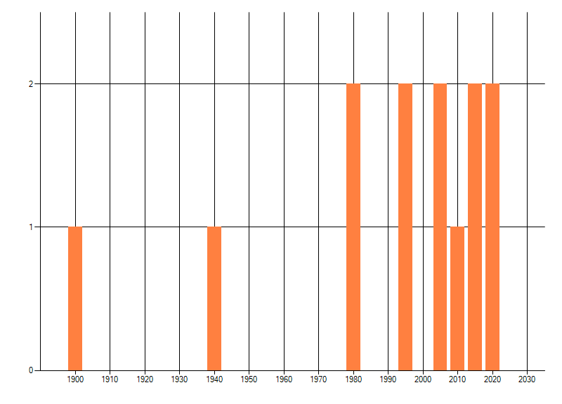 Het aantal atlasblokken (5x5 km) waarin de soort is gemeld binnen een periode van vijf jaar (vanaf 1980) of twintig jaar. Niet gecorrigeerd voor waarnemersinspanning en het aantal doorgegeven waarnemingen kan sterk variëren per periode, dus een trend in verspreiding kan hier niet direct uit worden afgelezen. Het opgegeven jaartal is het eerste jaar van de periode. Bron: gevalideerde waarnemingen uit de NDFF.