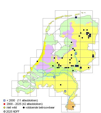 Het voor waarnemingsinspanning gecorrigeerde, of door een expert geschatte aantal atlasblokken (5x5 km) waarin de soort voorkomt per periode van tien jaar. Soms fluctueert het aantal sterk. Hoe vloeiender de lijn, des te betrouwbaarder de grafiek. Bron: Rode Lijst Mossen 2010. © BLWG 2011