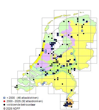 Het voor waarnemingsinspanning gecorrigeerde, of door een expert geschatte aantal atlasblokken (5x5 km) waarin de soort voorkomt per periode van tien jaar. Soms fluctueert het aantal sterk. Hoe vloeiender de lijn, des te betrouwbaarder de grafiek. Bron: Rode Lijst Mossen 2010. © BLWG 2011