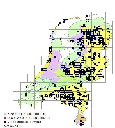 Het voor waarnemingsinspanning gecorrigeerde, of door een expert geschatte aantal atlasblokken (5x5 km) waarin de soort voorkomt per periode van tien jaar. Soms fluctueert het aantal sterk. Hoe vloeiender de lijn, des te betrouwbaarder de grafiek. Bron: Rode Lijst Mossen 2010. © BLWG 2011