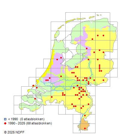 Het aantal atlasblokken (5x5 km) waarin de soort is gemeld binnen een periode van vijf jaar (vanaf 1980) of twintig jaar. Niet gecorrigeerd voor waarnemersinspanning en het aantal doorgegeven waarnemingen kan sterk variëren per periode, dus een trend in verspreiding kan hier niet direct uit worden afgelezen. Het opgegeven jaartal is het eerste jaar van de periode. Bron: gevalideerde waarnemingen uit de NDFF.