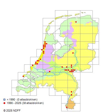 Het aantal atlasblokken (5x5 km) waarin de soort is gemeld binnen een periode van vijf jaar (vanaf 1980) of twintig jaar. Niet gecorrigeerd voor waarnemersinspanning en het aantal doorgegeven waarnemingen kan sterk variëren per periode, dus een trend in verspreiding kan hier niet direct uit worden afgelezen. Het opgegeven jaartal is het eerste jaar van de periode. Bron: gevalideerde waarnemingen uit de NDFF.