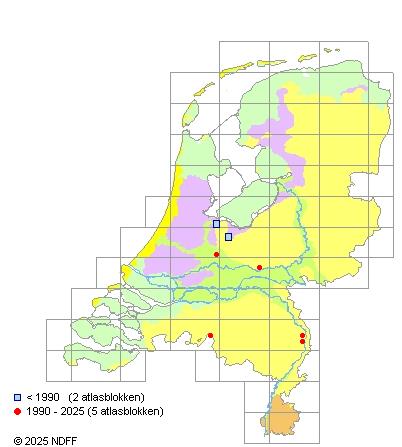 Het aantal atlasblokken (5x5 km) waarin de soort is gemeld binnen een periode van vijf jaar (vanaf 1980) of twintig jaar. Niet gecorrigeerd voor waarnemersinspanning en het aantal doorgegeven waarnemingen kan sterk variëren per periode, dus een trend in verspreiding kan hier niet direct uit worden afgelezen. Het opgegeven jaartal is het eerste jaar van de periode. Bron: gevalideerde waarnemingen uit de NDFF.